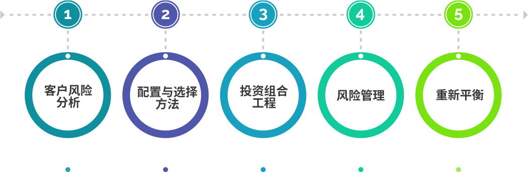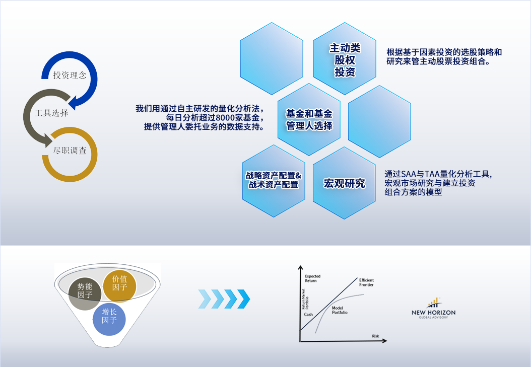 我们的战略和战术资产配置的框架制定均基于我们自行研究开发的量化方法。此外我们对投资工具(股票和基金)的选择也基于严格依靠数据支持,自行开发的量化筛选流程。此外,我们使用动态投资的方法以来应对市场和宏观经济条件中的重大变化并捕捉市场机会,从而为实现客户的投资目标提供了所需的灵活性。